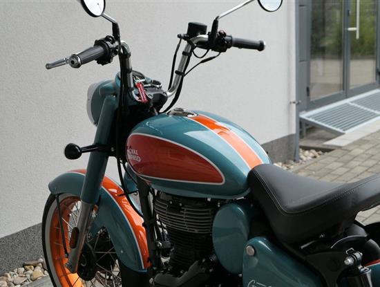 - Osvědčený motor 350 cm³ (J-platforma) – kultivovaný chod, spolehlivost a typický zvuk Royal Enfield