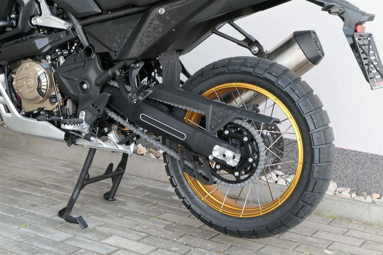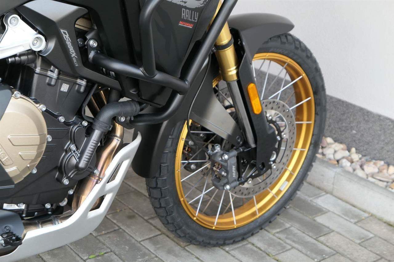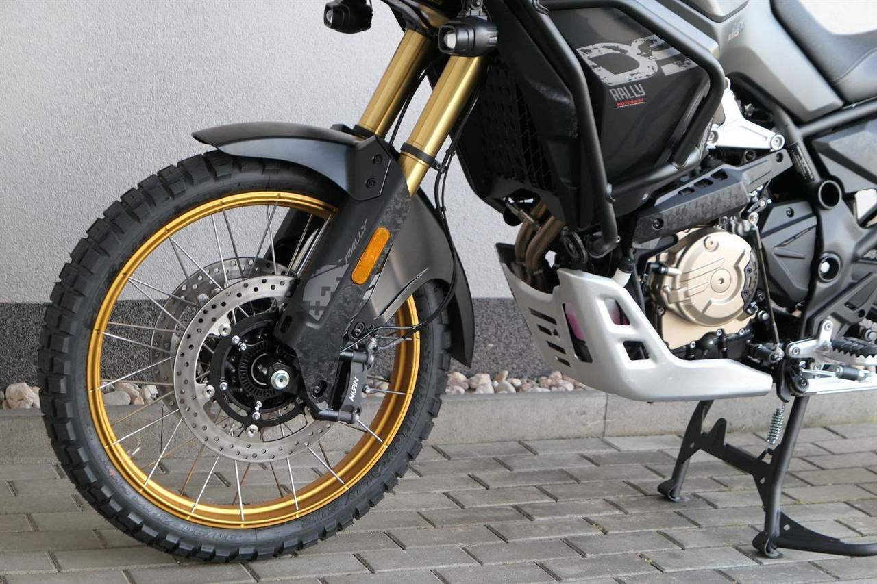 Vpředu najdeš jednadvacítku, vzadu osmnáctku – prostě offroad klasika. Kola jsou samozřejmě drátový a bezdušový. Na ráfkách dostaneš gumy Pirelli Scorpion Rally STR, který si hravě poraděj jak s asfaltem, tak s terénem.
