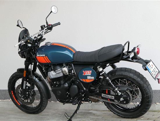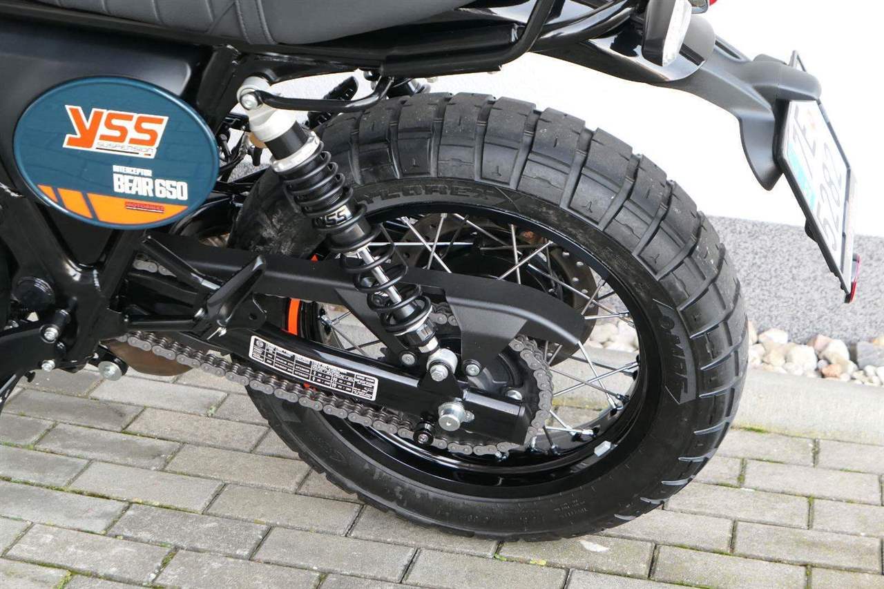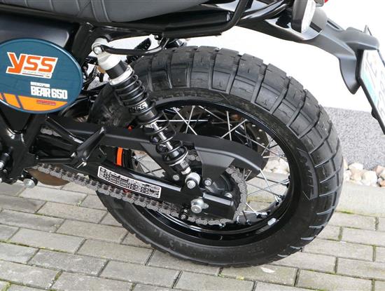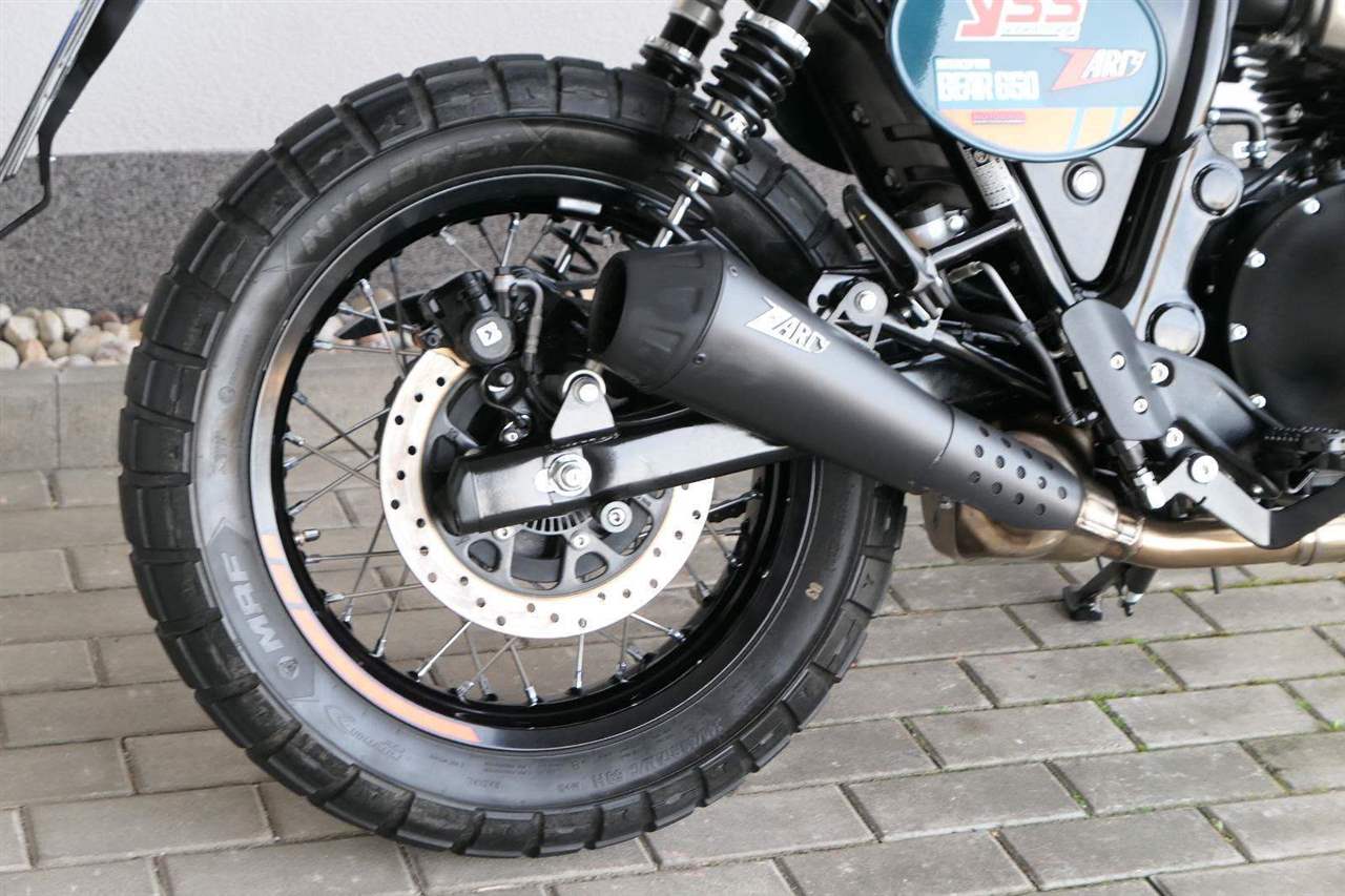 Silniční scramler s duší šedesátých let. Bear 650 ztělesňuje ducha šestnáctiletého nováčka, který se v roce 1960 seřadil vedle stovek spálených nadějí, všichni hladoví po vítězství v nejdivočejším závodě, jaký kdy kalifornská poušť znala - Big Bear Run.