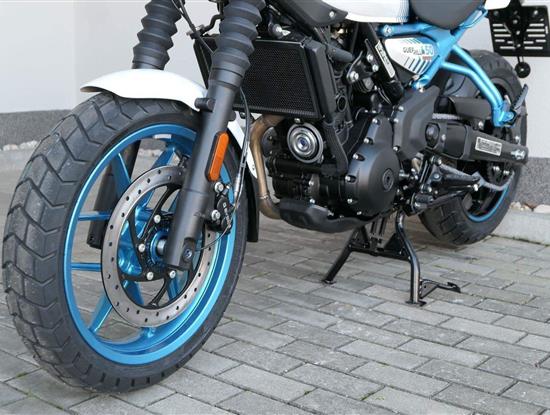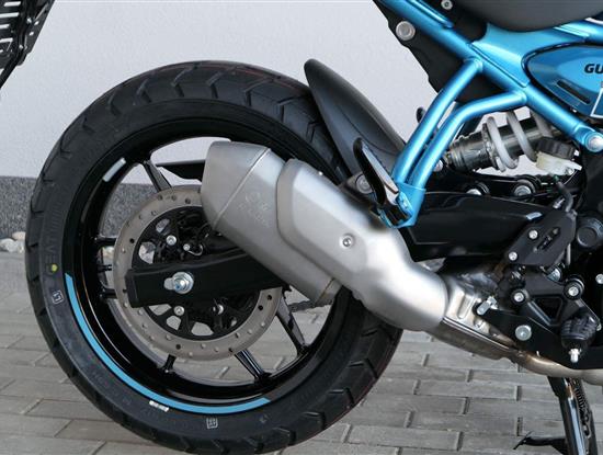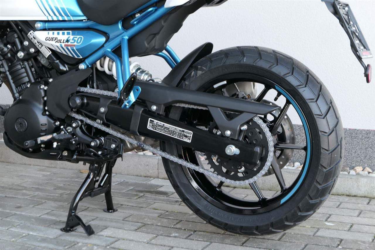 Kola jsou sedmnáctipalcová a Guerilla se chlubí přístupnou výškou sedla 780 milimetrů, stejně jako příjemnou pohotovostní hmotností 184 kilogramů. S ohledem na výkon a hmotnost jsou celkem dostačující i brzdy – vpředu jeden kotouč 310 milimetrů s dvoupístkovým brzdičem, vzadu 270 milimetrů s jednopístem. Do nádrže se vejde jenom skromných 11 litrů, na druhou stranu výrobce uvádí i skromnou tabulkovou spotřebu 3,39 litru na 100 kilometrů.