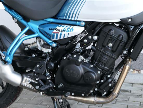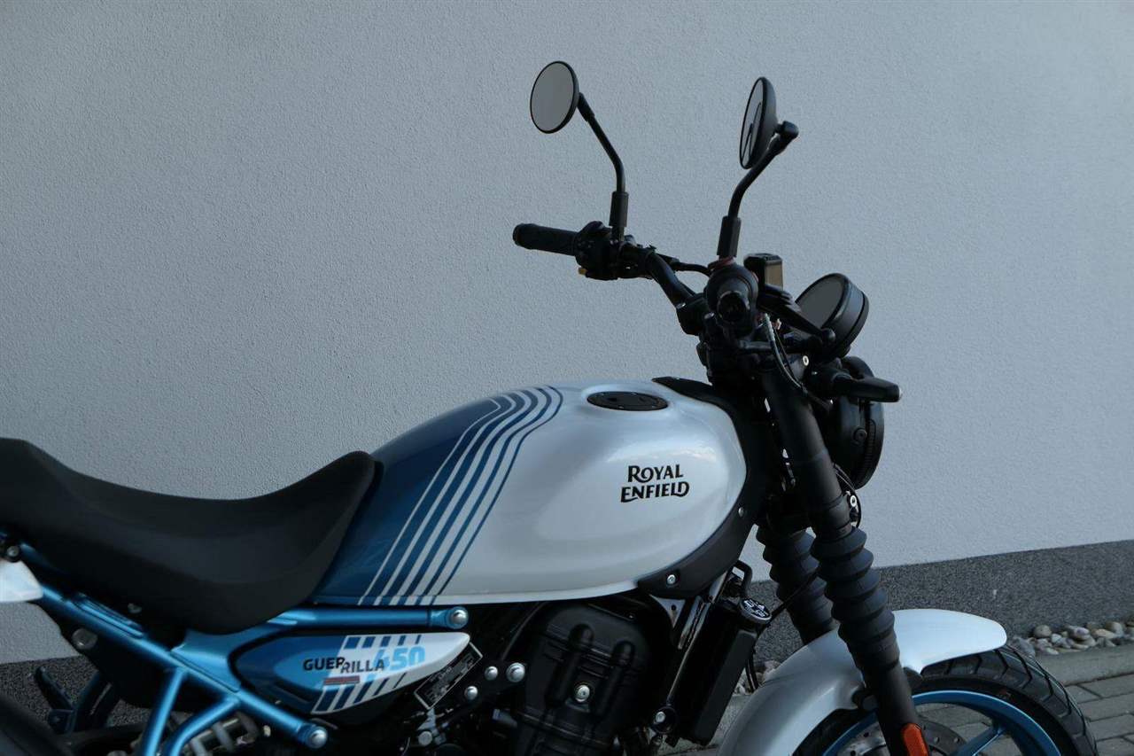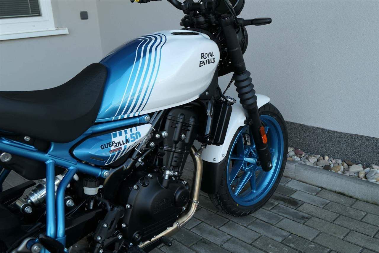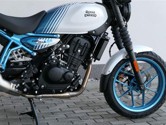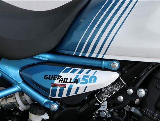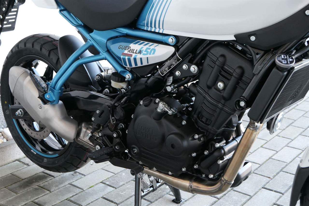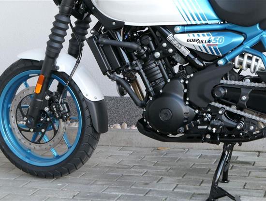 Z dosavadní modelové řady má Guerilla nejblíž Hunteru, působí ale moderněji a má i výrazně modernější techniku. Tak jako u aktuálního silnějšího Himalayanu 450 tvoří základ motorky trubkový páteřový rám, a v něm jako nosný prvek kapalinou chlazený jednoválec Sherpa o objemu 452 cm3. Relativně nový čtyřventil je mnohem výkonnější jednotkou než starší a menší vzduchem chlazené agregáty. Konkrétně nabídne rovných 40 koní v 8 000 otáčkách, a aby se to dobře pamatovalo tak i 40 Nm, které vrcholí v 5 500 otáčkách. Motor už má elektronický plyn a díky tomu i volitelné jízdní režimy – je ale poměrně jasné, který z dvojice „Eco“ a „Performance“ drtivá většina jezdců zvolí.