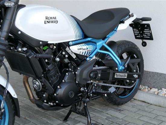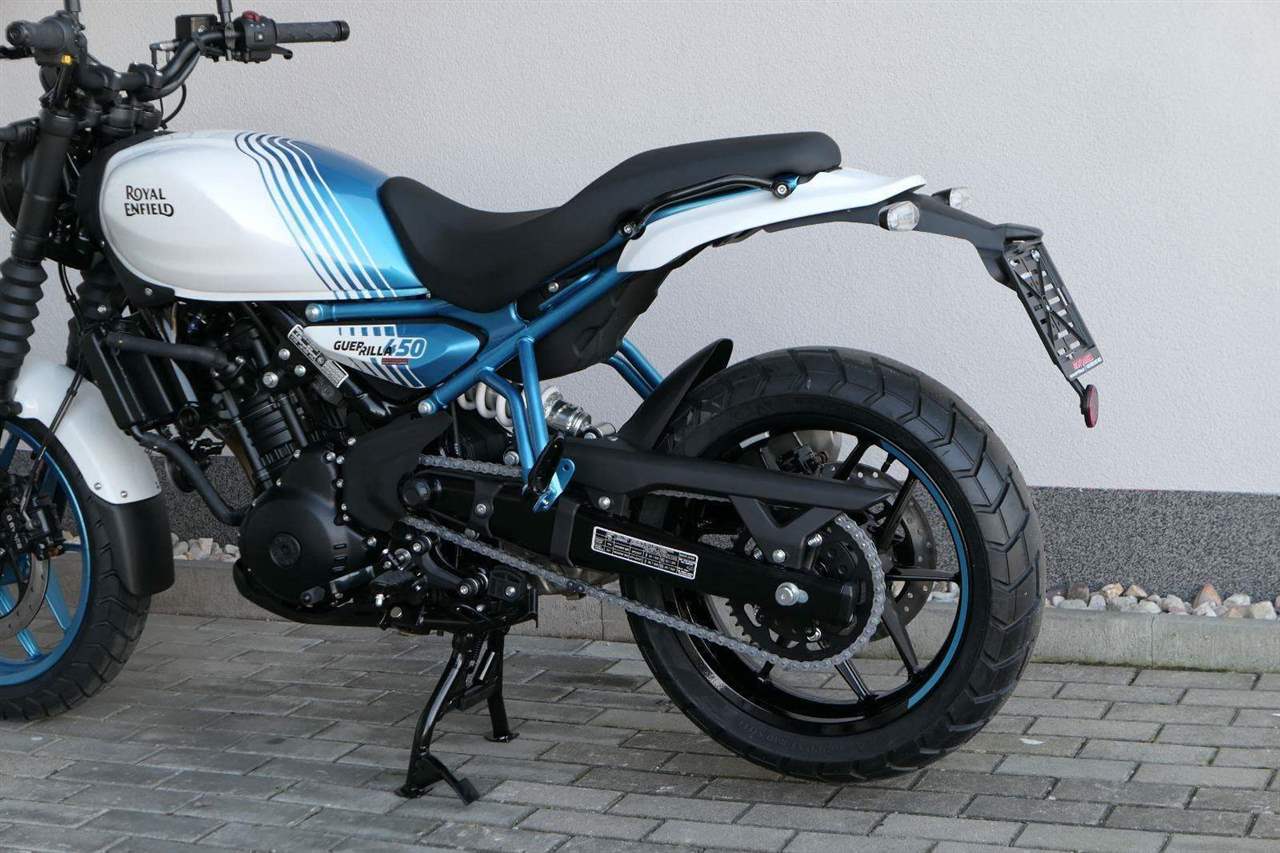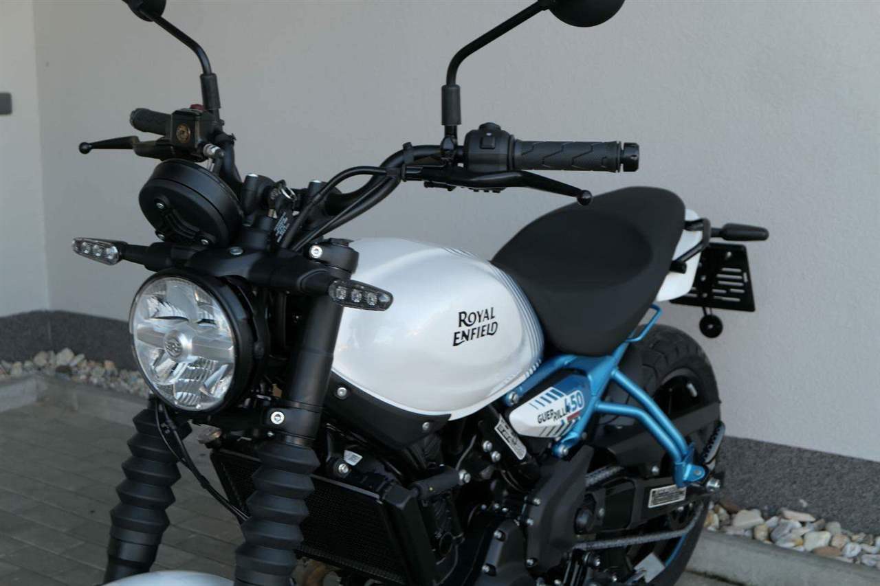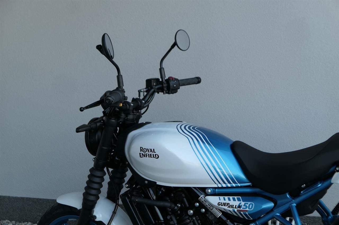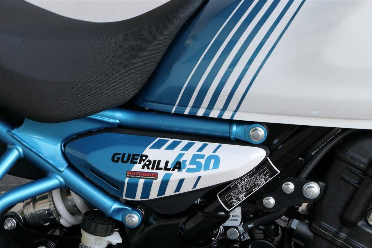 Z dosavadní modelové řady má Guerilla nejblíž Hunteru, působí ale moderněji a má i výrazně modernější techniku. Tak jako u aktuálního silnějšího Himalayanu 450 tvoří základ motorky trubkový páteřový rám, a v něm jako nosný prvek kapalinou chlazený jednoválec Sherpa o objemu 452 cm3. Relativně nový čtyřventil je mnohem výkonnější jednotkou než starší a menší vzduchem chlazené agregáty. Konkrétně nabídne rovných 40 koní v 8 000 otáčkách, a aby se to dobře pamatovalo tak i 40 Nm, které vrcholí v 5 500 otáčkách. Motor už má elektronický plyn a díky tomu i volitelné jízdní režimy – je ale poměrně jasné, který z dvojice „Eco“ a „Performance“ drtivá většina jezdců zvolí.