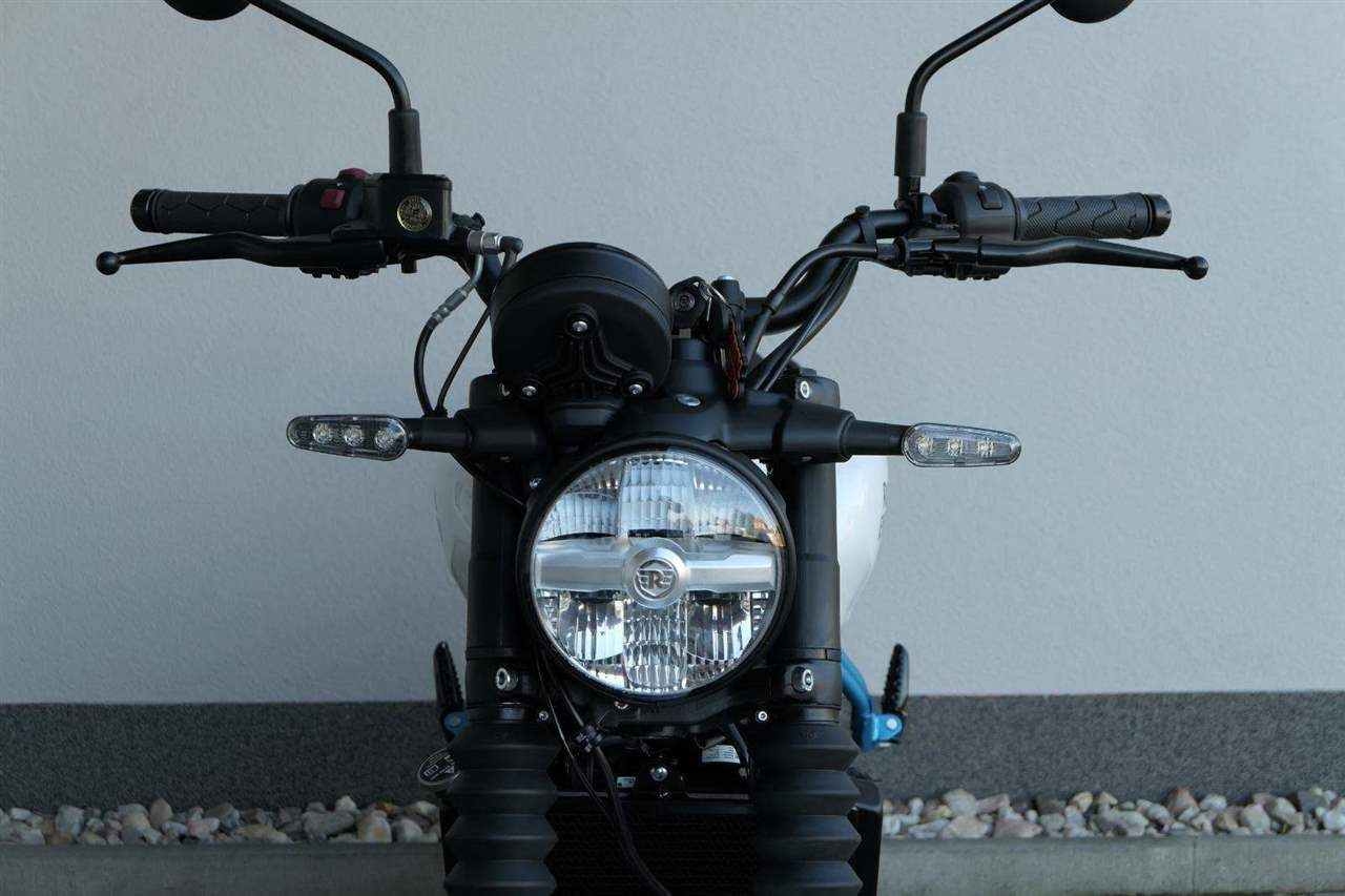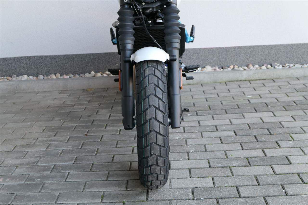 Na rozdíl od Himalayanu, nedělá si Guerrilla terénní ambice, byť některými prvky decentně připomíná, že je vlastně naháčo-scrambler – ve všech tiskových materiálech se pak objevuje populární termín „roadster“. Na teleskopických vidlicích jsou třeba prďácké retro prachovky, nicméně zdvih je jenom 140 milimetrů. Zadní vyosený centrál má potom 150 milimetrů.