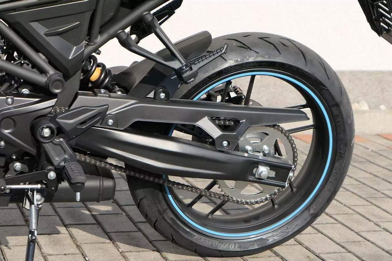 Podvozek je naladěn sportovně, ale přívětivě. Přední upside-down vidlice Ø 35 mm a zadní centrální tlumič zajišťují jistotu v zatáčkách i komfort při běžné jízdě. O bezpečné brzdění se starají kotoučové brzdy vpředu i vzadu doplněné o ABS, které je v základní výbavě. Díky provozní hmotnosti 136 kg je motocykl velmi snadno ovladatelný i pro méně zkušené jezdce.