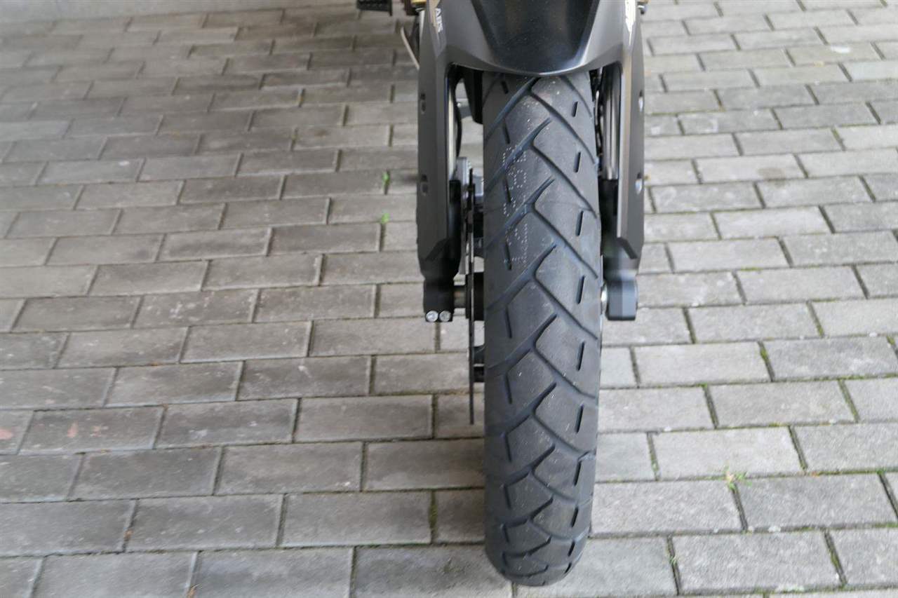 Na fešnejch drátěnejch kolech mám obutý bezdušový gumy Metzeler Tourance. Naprostej spoleh je na topový brzdy od japonskýho Nissinu. Pomocí dvou jízdních režimů mi snadno poručíš, jestli dáme piánko, nebo přitvrdíme v režimu sport.