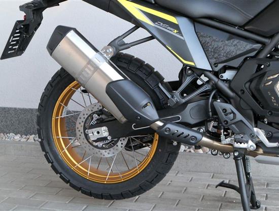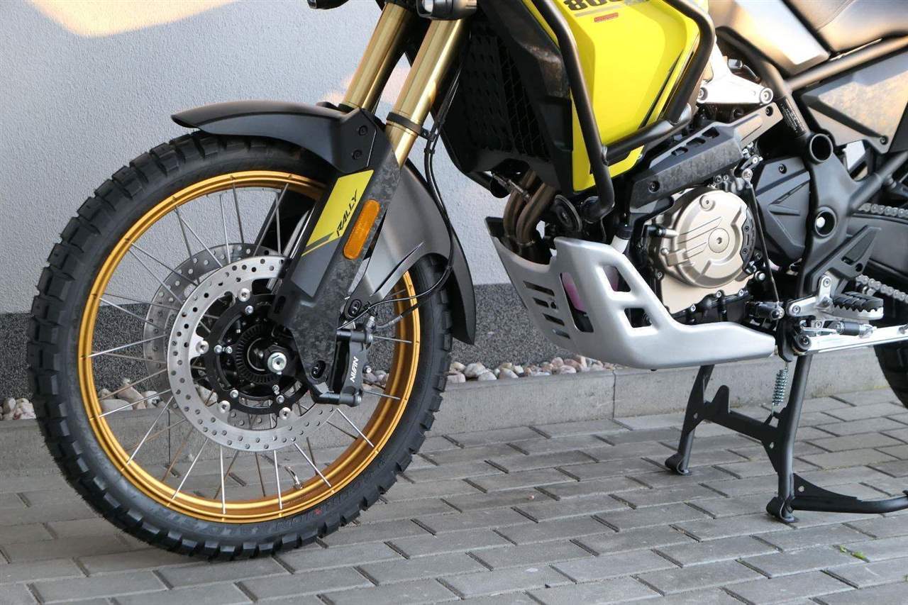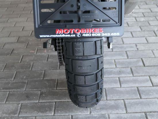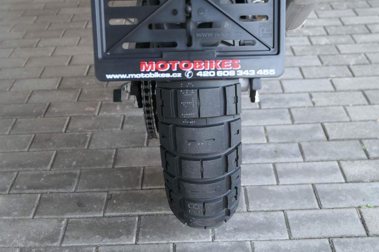 Offroadový kola jak zákon káže. Vpředu najdeš jednadvacítku, vzadu osmnáctku – prostě offroad klasika. Kola jsou samozřejmě drátový a bezdušový. Na ráfkách dostaneš gumy Pirelli Scorpion Rally STR, který si hravě poraděj jak s asfaltem, tak s terénem.