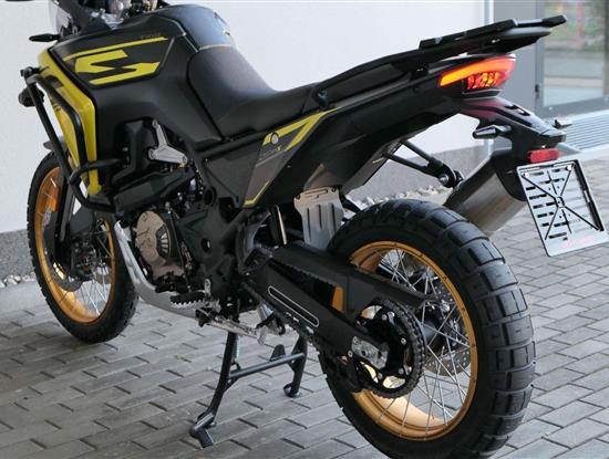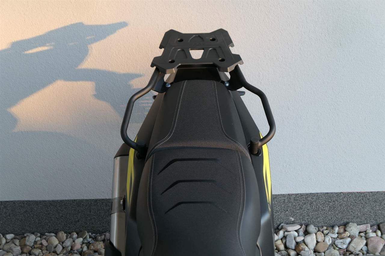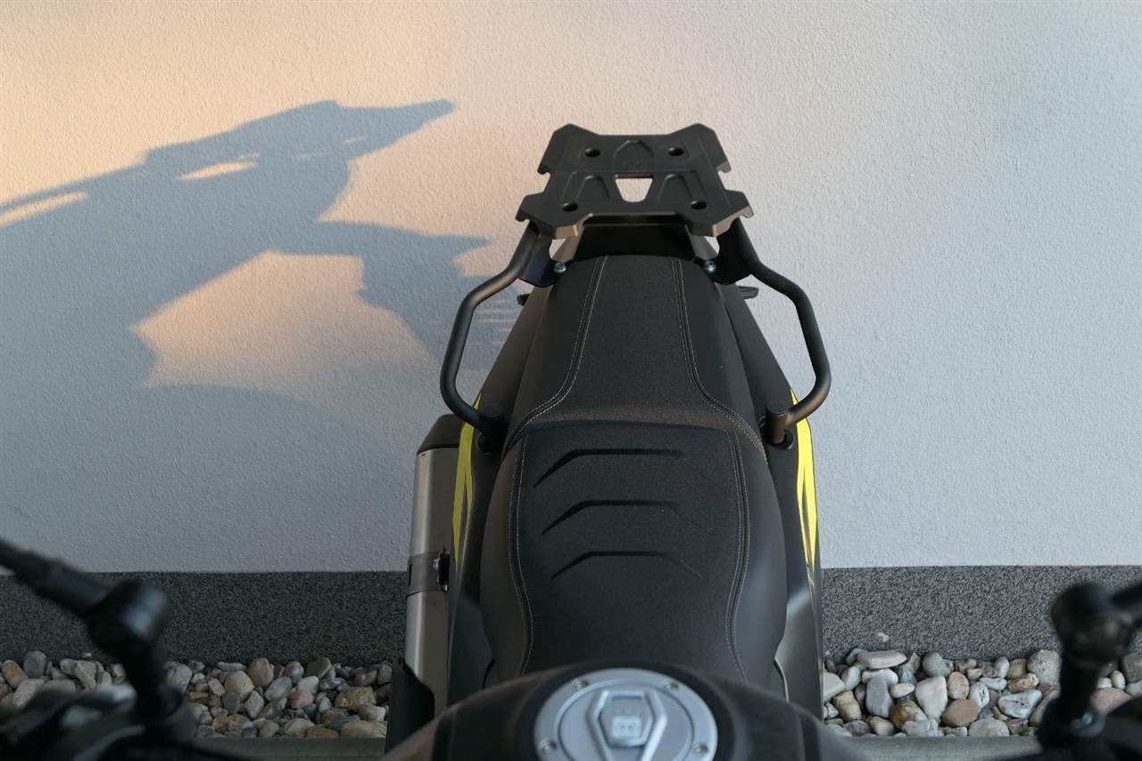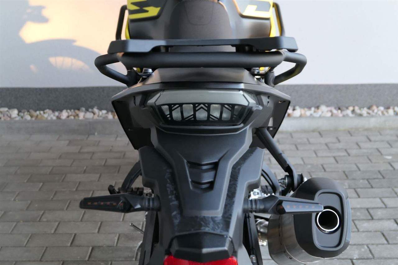 Stylovej zadek s nosičem. Za tímhle zadkem se obdivně otočí i nemotorkáři. Ostrý linky rudejch světel i štíhlý blikačky dávaj najevo, že tahle mašina nemá daleko ke stíhačce. Všecko svícení je samozřejmě komplet v LEDu. V základu dostaneš taky zadní nosič, takže nasaď kufry a pořádnej trip může začít!