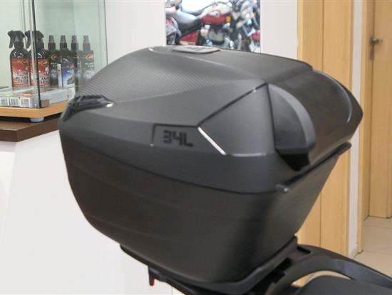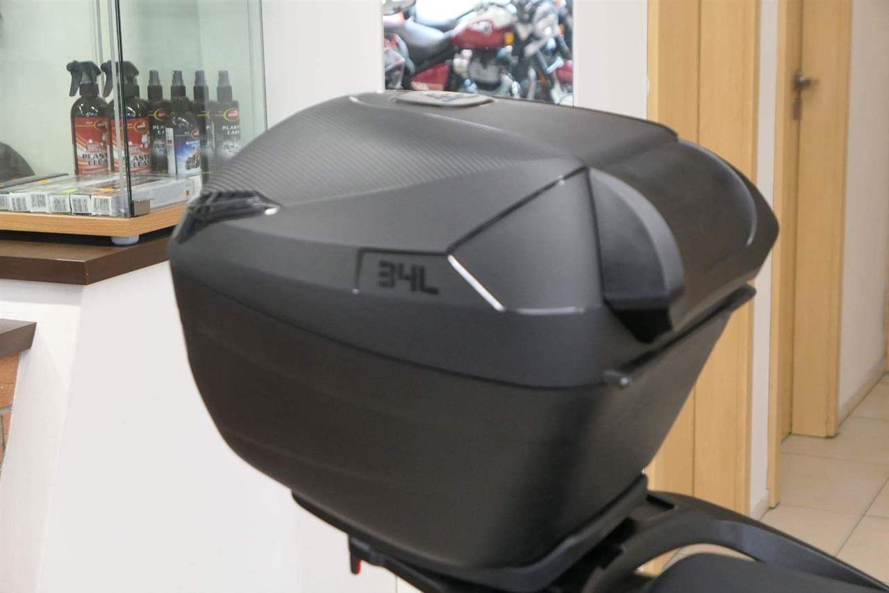 Pod sedlo hodíš běžnej nákup, případně jetku nebo menší integrálku. A kdybys vyrazil na větší nákup, už v základu dostaneš zadní hliníkovej nosič s 34litrovým kufrem. Drobnosti si schováš do uzavíratelný přihrádky s USB, kterou mám v předním štítu.