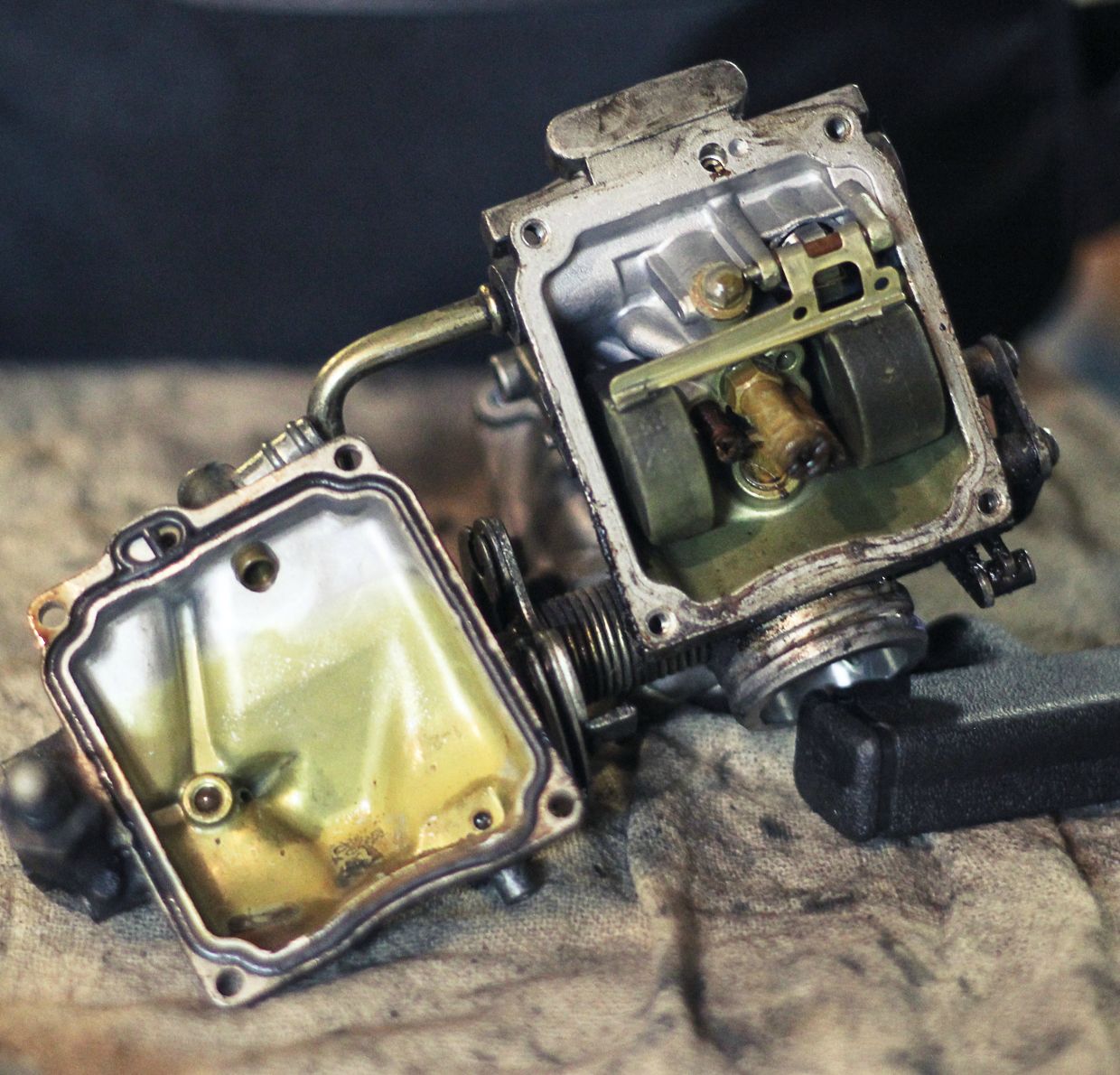 Další možnost je vyndat ho z motorky a kompletně ho rozebrat. Při rozebírání dej však pozor na podtlakové membrány, pružinky a jehlu pod plovákem. Tyto součástky rády vyskakují a špatně se po dílně hledají. Součástky se ponoří do roztoku čističe, či nějakého jiného rozpouštědla (pozor na o-kroužky a těsnění, mohou nabobtnat, nebo se rozpustit! ) a nech působit. Když jsou součástky hodně zarostlé nečistotami, neboj se lehce použít i šroubovák k odstranění.